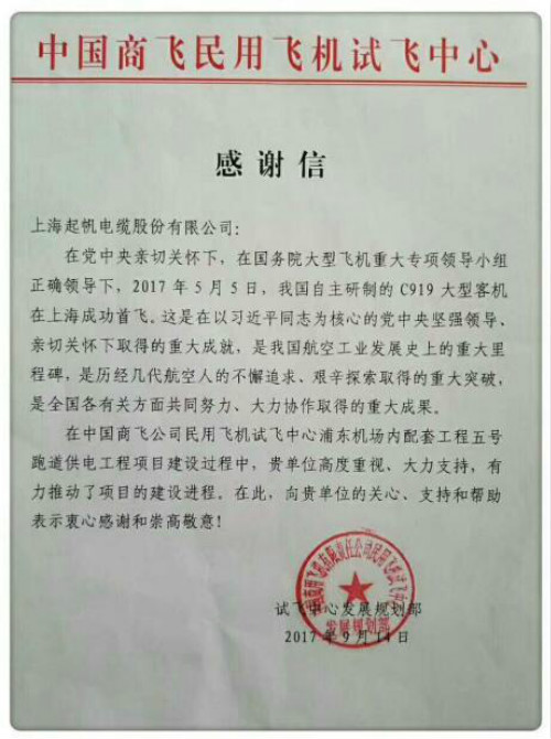 感谢上海雷竞技电竞平台 电缆对C919试飞成功的大力支持